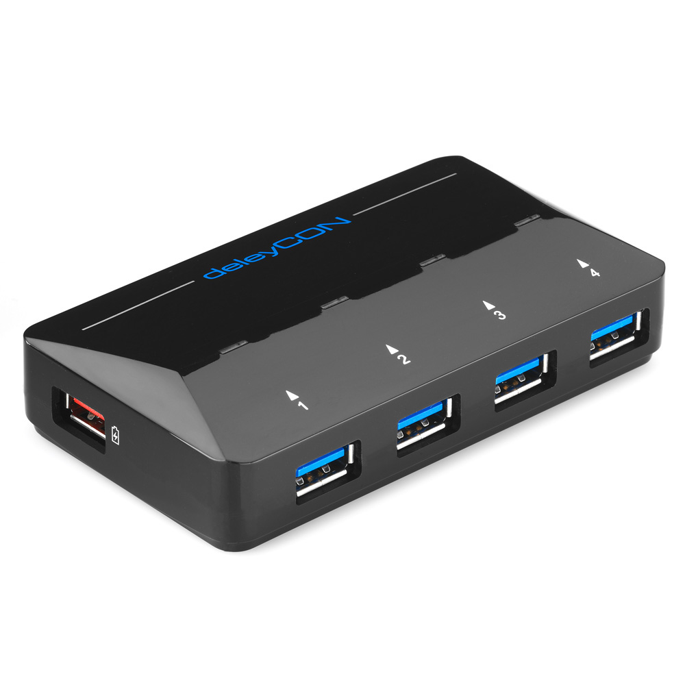 / deleyCON 4 Port USB 3.0 Hub – Aktiv mit Netzteil + 1 EXTRA Schnellladeport 2,4A