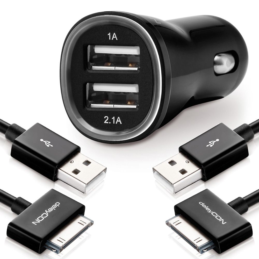 SET deleyCON DUAL KFZ Ladegerät + 2x 1m 30pin iPhone Kabel (2 Stück) [Schwarz]