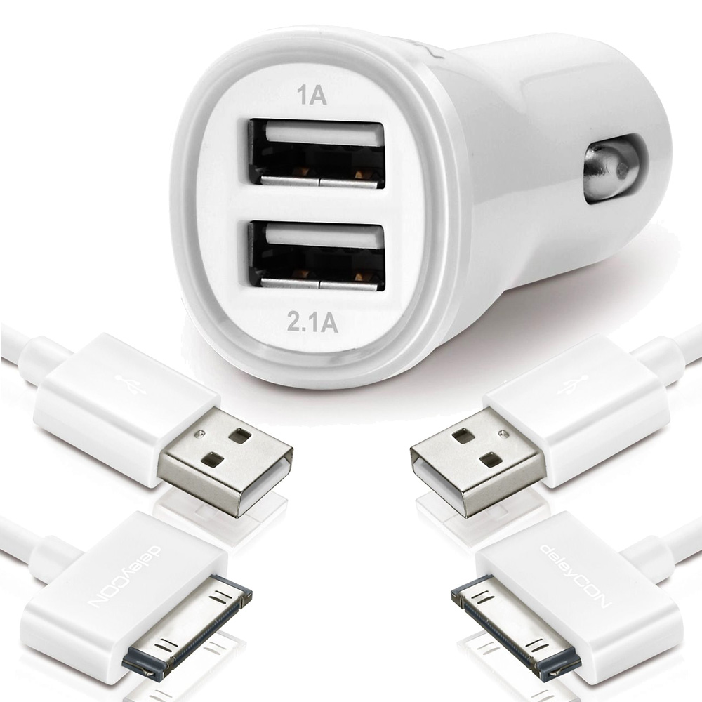 SET deleyCON DUAL KFZ Ladegerät + 2x 1m 30pin iPhone Kabel (2 Stück) [Weiß]