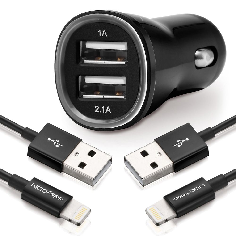 SET deleyCON DUAL KFZ Ladegerät + 2x 1m Lightning Kabel (2 Stück) [Schwarz]