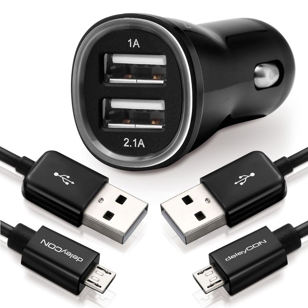 SET deleyCON DUAL KFZ Ladegerät + 2x 1m microUSB Kabel (2 Stück) [Schwarz]